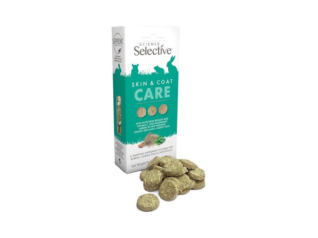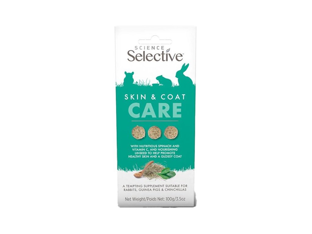 Chutné pamlsky Science Selective Skin & Coat Care mají vysoký obsah vlákniny a obsahují lněné semínko bohaté na omega-3 a omega-6 mastné kyseliny, špenát a vitamín C. Pomáhají podporovat zdraví kůže a srsti u králíků, morčat a činčil s citlivou pokožkou (snadno podrážděnou, se klony ke svědění, suchou nebo šupinatou) a problematickou srstí (řídnoucí, matnou nebo zplihlou). Pamlsky jsou ideální pro krmení z ruky – k navázání či prohloubení vztahu s drobným mazlíčkem. Složení je čistě přírodní, bez umělých barviv, příchutí a přidaných cukrů.