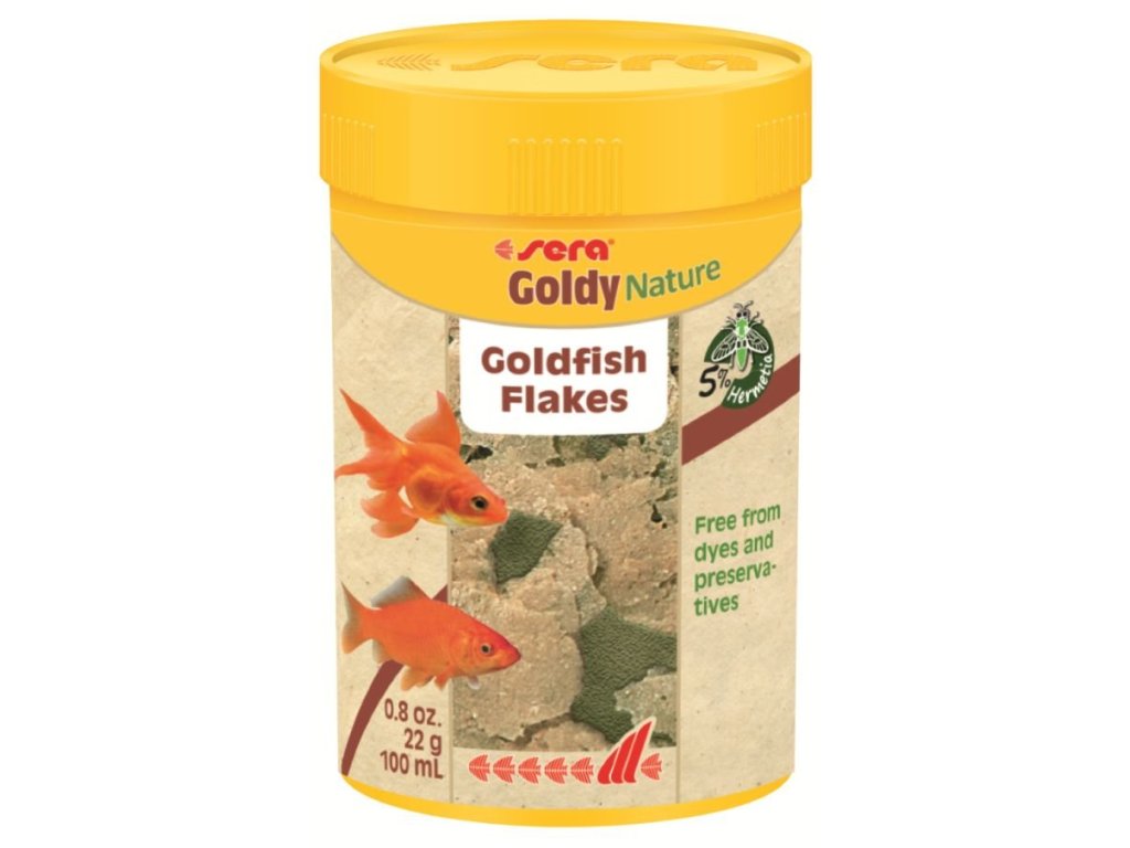 Sera Goldy Nature je přírodní základní krmivo pro menší zlaté rybky (včetně náročných okrasných forem) a ostatní vybíravé studenovodní ryby. Směs neobsahuje barviva a konzervační látky. Díky hmyzí moučce z mušek Hermetia obsahuje zdroj vysoce kvalitních bílkovin, které navíc šetří zdroje. Vyvážený poměr rostlinných a živočišných složek zajišťuje snadno stravitelné krmivo podporující zdravý růst a nádherné vybarvení. Vločky si drží svůj tvar, jsou vhodné pro studenovodní ryby vyhledávající potravu na hladině, a nekalí vodu.