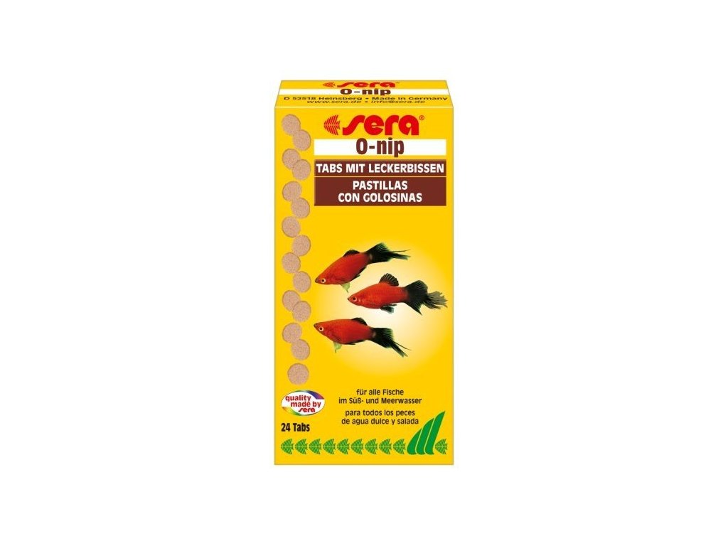 Sera O-nip je žádané tabletové krmivo pro všechny sladkovodní i mořské ryby a mnoho nižších živočichů. 50 % se skládá z vysoce hodnotného vločkového krmiva a lyofilizovaných živočichů (FD). Tabletu Sera O-nip můžete lehkým tlakem prstu přilepit na stěnu akvária. Bude tak možné sledovat jak žerou i plaché ryby. Sera O-nip je také hodnotným krmivem pro sumečky a mřenky, a to díky hodnotným ingrediencím s lehce stravitelnými bílkovinami.