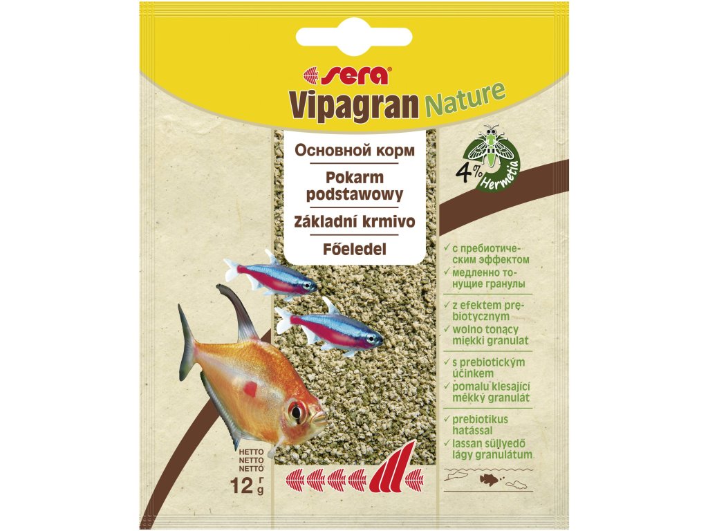 Sera Vipagran je spolehlivé základní krmivo pro všechny okrasné ryby, které hledají potravu ve středních vrstvách vodního sloupce. Díky šetrnému zpracování si zachovají hodnotné látky BIO-VIP formule a použité suroviny (omega mastné kyseliny, betaglukany, astaxantin, esenciální aminokyseliny, vitaminy, minerální látky, stopové prvky, sekundární rostlinné látky a další). Výsledkem jsou nádherné barvy, zdravý růst, silný imunitní systém a vitalita. Obzvláště měkký a přitom stabilní granulát pomalu klesá a zůstává dostatečně dlouho ve střední zóně vody, kde ho ryby zcela přijmou. Voda není zbytečně zatěžována. Obsahuje řasu spirulina.