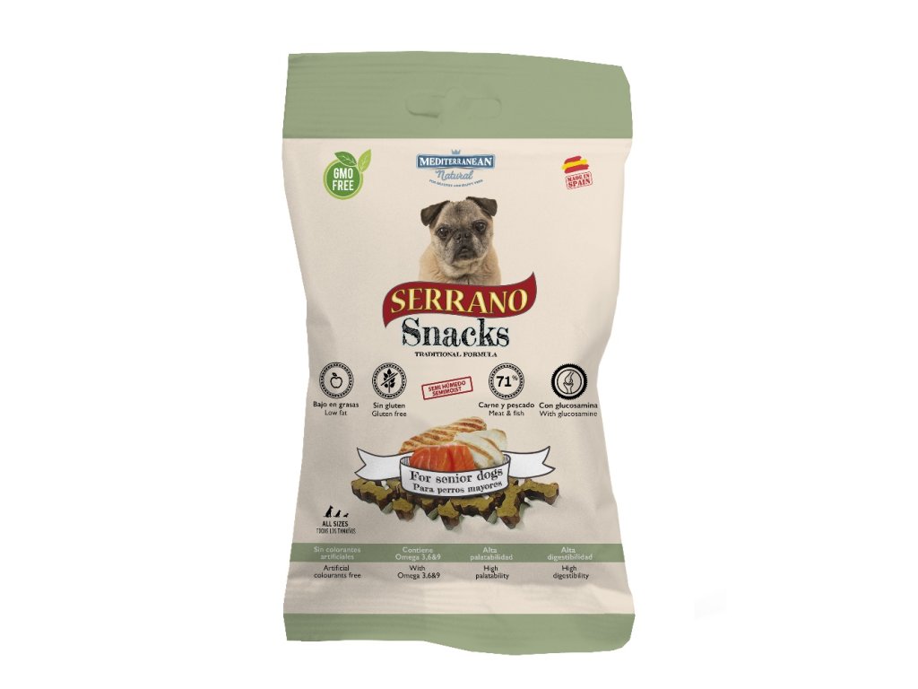 Lahodný pamlsek pro psí seniory od 7 let věku ve tvaru malých kostiček se serrano šunkou a krůtím masem. Obsahuje 71 % čerstého masa.