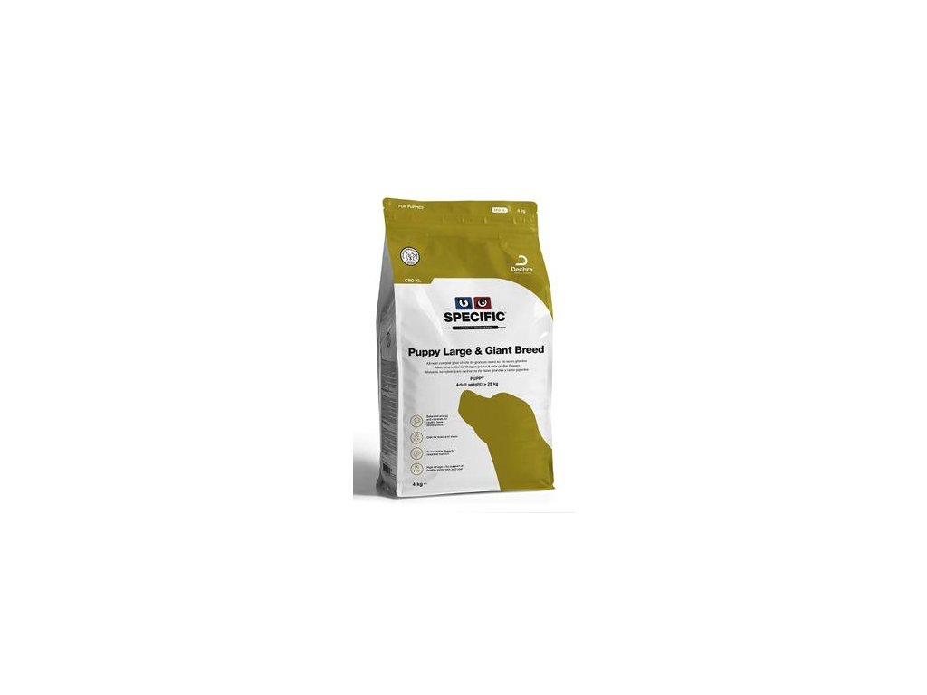 Doplňující informace Přiměřený obsah energie a doplněk L-karnitinu napomáhá snadnému udržování ideální tělesné hmotnosti a růstových proporcí štěněte. Toto krmivo je velmi vhodné pro štěňata velkých a obřích plemen. SPECIFIC™ CPD-XL Puppy large & Giant Breed je možné podávat od doby odstavu (5.-6. týden života) do dosažení 80% tělesné hmotnosti dospělého jedince. Poté je vhodné postupně přejít na krmivo SPECIFIC™ CXD-XL Adult large & Giant Breed/CXW Adult All Breeds. Velikost granulí je přizpůsobena velikosti štěňat velkých a obřích plemen tak, aby bylo stimulováno žvýkání, prodloužila se doba příjmu krmiva a předešlo se hltání potravy. Je velmi důležité pravidelně monitorovat růst štěňat, aby se předešlo překrmování. Kontraindikace SPECIFIC™ CPD-XL Puppy large & Giant Breed není vhodným krmivem pro březí a kojící feny, protože má nižší energetický obsah a nižší obsah vápníku, než SPECIFIC™ CPD-S Puppy Small Breed a SPECIFIC™ CPD-M Puppy Medium Breed. Pro březí a kojící feny velkých a obřích plemen je proto doporučeno krmivo SPECIFIC™ CPD-M Puppy Medium Breed. Pro štěňata s výrazně nižším příjmem energie, než který je uveden v tabulce, je doporučeno krmivo SPECIFICTM CPD-M Puppy Medium Breed. Složení Rýže, pšenice, kukuřičný protein, bílá rybí moučka, vepřový tuk, kvasnice (zdroj β-1,3/1,6 – glukanů), hydrolyzovaný kuřecí protein, minerální látky, rybí olej, vejce, prášková celulóza, vitamíny a stopové prvky, psyllium, lysin, methionin, threonin, tryptofan a L-karnitin. Antioxidanty: Aditiva schválená EC: BHA, BHT, propyl-galát. Neobsahuje syntetická barviva ani zchutňovadla.