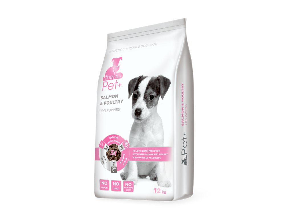 Kompletní krmivo ThePet+ Salmon & Poultry Puppies je ideální pro štěňata do 12 měsíců věku, pro březí (od 3/3 březosti) a kojící feny.Krmivo obsahuje čerstvé maso z lososa a drůbeží maso, které je ideální pro svou stravitelnost a je zdrojem plnohodnotných bílkovin, tuků, vitamínů a zároveň přispívá ke správné funkci štítné žlázy.Omega 3 mastné kyseliny pomáhají ke správnému vývoji mozku a podporují lepší koncentraci a paměť. Rozmarýn je přírodní antioxidant, který chrání buňky před jejich poškozením a podporuje obranyschopnost imunitního systému.Krmivo pro štěňata obsahuje bylinky, lososový olej pro zdravou a lesklou srst.