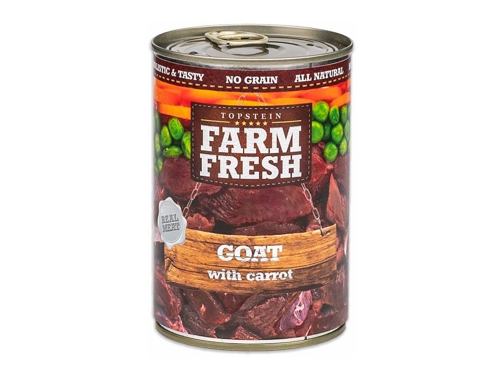 Složení: Maso z kozy a její vedlejší produkty živočišného původu, mrkev 5%, hrášek 4%, minerální látky 1%, slunečnicový olej 0,2%.