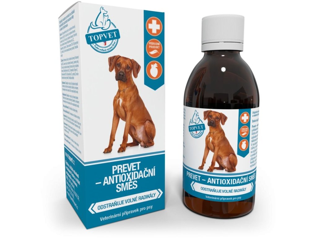 PREVET obsahuje vysoce kvalitní oleje, bylinný komplex a Astaxanthin, což je v současnosti nejsilnější známý antioxidant. Úlohou antioxidantů je pohlcovat v těle volné radikály, které hrají zásadní roli při vzniku desítek onemocnění. Mezi ta nejzávažnější patří nádorová onemocnění, onemocnění srdce a cév, selhání imunitního systému. V současné době se vlivem znečištěného životního prostředí, účinkem UV záření, používáním chemických látek a dalších faktorů volné radikály tvoří ve zvýšené míře. Je často porušována rovnováha mezi nimi a antioxidanty a vzniká oxidační stres. Proto je nutné naše mazlíčky chránit. Naši mazlíčci se přirozeně pohybují do půl metru nad zemí, v ?zóně smrti?, kde je vysoká koncentrace toxických látek. Proto je nutné je chránit! Preparát navíc zpomaluje stárnutí, posiluje mozek, zlepšuje kvalitu srsti a zraku, působí protizánětlivě a zvyšuje imunitu. Pomáhá zvýšit vytrvalost a sílu, úroveň energie a snižuje únavu. Návod k použití: Podávejte 5 ml (čajová lžíce) přípravku na 10kg hmotnosti psa denně. Přípravek podávejte po dobu 2 měsíců, tuto kúru opakujte alespoň dvakrát ročně. Přípravek je možné podávat i trvale. Olej se velmi dobře aplikuje v potravě. Výhodou je příjemná chuť. Složení: Ostropestřecový olej za studena lisovaný, Kokosový olej BIO, Lněný olej za studena lisovaný, Lososový olej, Chia olej za studena lisovaný, Hroznový olej za studena lisovaný, Rakytníkový olej CO2, Astaxanthin, Vitamin E, Beta-karoten 30%, Rozmarýnový CO2 extrakt, Žen-šen standardizovaný extrakt, Rhodiola extrakt