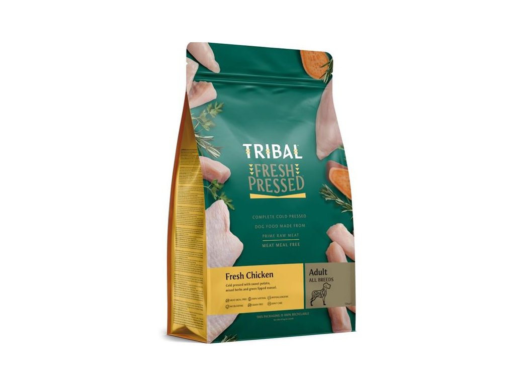 Receptura TRIBAL Fresh PressedTM Adult Chicken obsahuje 53 % čerstvého kuřete, ryb a vajec + batáty, směs bylin, slávku zelenoústou a mnoho dalších hodnotných ingrediencí. Určená je především pro dospělé psy.Krmiva TRIBAL Fresh PressedTM (zastudena lisovaná) kombinují prémiovou čerstvou drůbež (kuře, krůta, kachna) nebo ryby (losos) s vejci, batáty, bylinkami a velkorysým množstvím kloubní výživy tak, aby každá receptura byla vhodná pro psy všech kategorií, zejména však pro psy se sklony k alergickým reakcím a kožním či zažívacím potížím a pro vybíravé jedlíky.Speciální způsob přípravy lisováním za nízkých teplot pomáhá uchovat v krmivu maximum živin a chutí. Granule jsou také hutnější než běžné extrudy – v psím žaludku díky tomu nebobtnají a neplavou, ale ihned se začnou pozvolna rozpadat, aby uvolnily veškeré v sobě obsažené živiny. Protože jsou těžší než běžné granule, výrobce doporučuje odměřovat denní dávku pomocí váhy.Krmiva neobsahují žádnou masovou moučku, vepřové, hovězí, obiloviny ani hrášek. Veškeré maso pochází od zodpovědně hospodařících farmářů a rybářů.