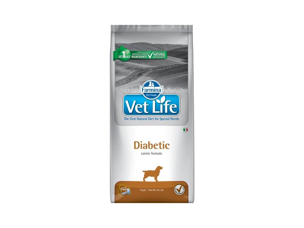 Farmina Vet Life Diabetic je kompletní dietetické krmivo pro dospělé psy určené jako podpora kontrolovaného přísunu glukózy (Diabetes mellitus). Doporučuje se obzvláště pro Diabetes typu 2 a zvyšuje účinek insulinové terapie v případě Daibetu typu 1. Je vhodné také pro snížení tělesné hmotnosti zvířete.