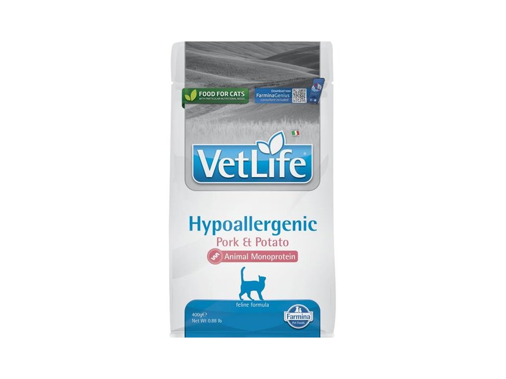 Farmina Vet Life Hypoallergenic Pork & Potato je kompletní suché dietetické krmivo pro dospělé kočky určené ke snížení výskytu potravinových alergií a nesnášenlivostí (intolerancí). Granule se používají také pro podporu správných funkcí kůže v případě kožních poruch a nadměrné ztráty srsti. Jediným zdrojem proteinů v krmivu je dehydratovaný vepřový protein a jediným zdrojem sacharidů batáty, čímž je eliminována nesnášenlivost vůči jiným složkám potravy.