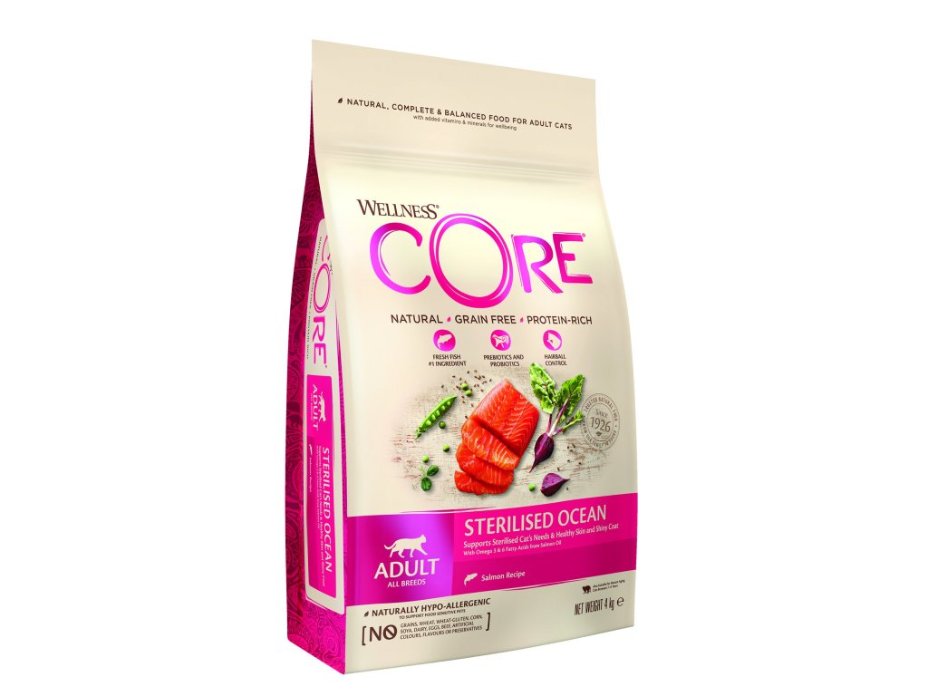 Zdravou pokožku, lesklou srst a optimální váhu zajistíte vaší kočce superprémiovým krmivem Wellness CORE Sterilized Ocean, které je zdrojem omega 3 a 6 mastných kyselin z lososového oleje. Krmivo, které bylo navrženo speciálně pro sterilizované kočky, udrží kočku zdravou a v optimální váze. Obsahuje pouze vysoce kvalitní bílkovinné přísady. Základem krmiva je čerstvé maso z lososa. Receptura bez drůbeže je ideální pro kočky, které potřebují jiný zdroj bílkovin (pro citlivé kočky, které nemohou jíst drůbeží proteiny). Se sníženým obsahem kalorií odpovídá sníženým potřebám méně aktivních nebo sterilizovaných koček. Zároveň je vhodná také pro starší kočky mezi 7-11 lety. Jedná se o přírodní, kompletní a vyváženou recepturu spolu s jedinečnou směsí zdravých zelenin, superpotravin a doplňků výživy. Díky vysokému množství vlákniny, podporuje snižování tvorby trichobezoárů.
