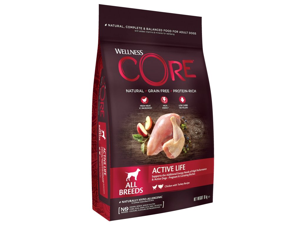 Krmivo je určeno pro vysoce výkonné psy, kteří tráví hodně času venku a potřebují být ve střehu a aktivní po delší dobu. Tato receptura se také doporučuje březím nebo kojícím fenám, aby zůstaly silné a co nejlépe se postaraly o svá štěňata. Všechny granule Wellness Core jsou nabité vysoce kvalitními živočišnými bílkovinami spolu s jedinečnou směsí zdravé zeleniny a superpotravin, rostlinných látek a doplňků výživy, bez plniv a obilovin. Active Life navíc podporuje jejich dodatečné energetické potřeby díky kombinaci vysoce kvalitních bílkovin a vyššímu obsahu tuku. Snadno stravitelná receptura obsahuje prebiotickou vlákninu a probiotika i glukosamin hydrochlorid a chondroitin sulfát pro podporu kyčlí a kloubů.