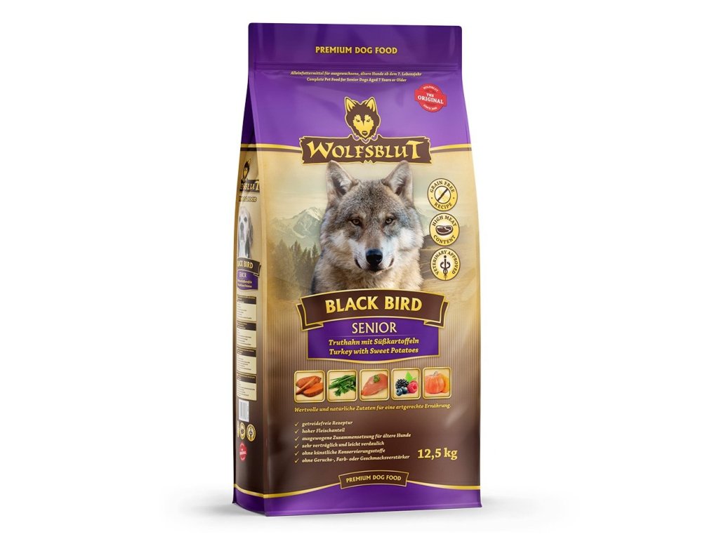 Vlci loví svou kořist od Skalistých hor Severní Ameriky, arktické tundry, hor a lesů Evropy až po pouště a stepi střední Asie. To jim dodává maso a vnitřnosti bohaté na živiny, ale také zeleninu, ovoce, bobule, kořeny a bylinky z obsahu žaludku kořisti. Obilí zde není zahrnuto. Vlk tak přijímá potřebné vitamíny, minerály, stopové prvky, enzymy a druhotné rostlinné látky. Vzhledem k tomu, že vlk je předkem všech psů, naše suché krmivo pro psy Wolfsblut je založeno na přirozených stravovacích návycích vlka. Obsahuje hodně masa nebo ryb v kombinaci se superpotravinami, které obsahují hodnotné ingredience – stejně jako v přírodě, bez obilovin. Náš výběr výjimečných druhů masa a superpotravin bohatých na živiny vychází z vlčích biotopů a jejich pestré stravy. Wolfsblut nabízí každému psovi druhově vhodnou a originální stravu a díky rozmanitosti odrůd si každý najde něco, co snese. Receptura na suché krmivo BLACK BIRD SENIOR kombinuje výživu vlků s nejnovějšími vědeckými poznatky o správné výživě psů.