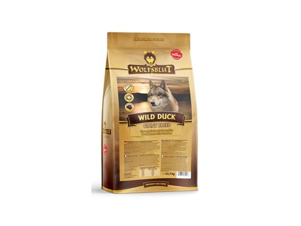 Vlci loví svou kořist od Skalistých hor Severní Ameriky, arktické tundry, hor a lesů Evropy až po pouště a stepi střední Asie. To jim dodává maso a vnitřnosti bohaté na živiny, ale také zeleninu, ovoce, bobule, kořeny a bylinky z obsahu žaludku kořisti. Obilí zde není zahrnuto. Vlk tak přijímá potřebné vitamíny, minerály, stopové prvky, enzymy a druhotné rostlinné látky. Vzhledem k tomu, že vlk je předkem všech psů, naše suché krmivo pro psy Wolfsblut je založeno na přirozených stravovacích návycích vlka. Obsahuje hodně masa nebo ryb v kombinaci se superpotravinami, které obsahují hodnotné ingredience – stejně jako v přírodě, bez obilovin. Náš výběr výjimečných druhů masa a superpotravin bohatých na živiny vychází z vlčích biotopů a jejich pestré stravy. Wolfsblut nabízí každému psovi druhově vhodnou a originální stravu a díky rozmanitosti odrůd si každý najde něco, co snese. Receptura suchého krmiva WILD DUCK GIANT kombinuje výživu vlků s nejnovějšími vědeckými poznatky o správné výživě psů.
