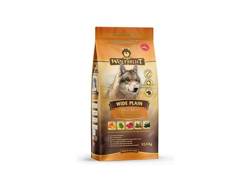 Vlci loví svou kořist ve Skalistých horách Severní Ameriky, arktické tundře, v horách a lesích Evropy a dokonce i v pouštích a stepích střední Asie. To jim poskytuje maso a vnitřnosti bohaté na živiny, ale také zeleninu, ovoce, bobule, kořeny a bylinky prostřednictvím obsahu žaludku kořisti. Obilí zde není zahrnuto. Vlk tak dostává potřebné vitamíny, minerály, stopové prvky, enzymy a druhotné rostlinné látky. Vzhledem k tomu, že vlk je předkem všech psů, naše suché krmivo pro psy Wolfsblut je založeno na přirozených stravovacích návycích vlka. Obsahuje hodně masa nebo ryb v kombinaci se superpotravinami, které obsahují hodnotné ingredience – stejně jako v přírodě, bez obilovin. Náš výběr výjimečných mas a superpotravin bohatých na živiny je založen na vlčím prostředí a jeho rozmanité stravě. Wolfsblut nabízí každému psovi druhově vhodnou a přirozenou stravu a díky rozmanitosti odrůd si každý něco toleruje. Receptura suchého krmiva WIDE PLAIN LARGE BREED kombinuje stravu vlka s nejnovějšími vědeckými poznatky o správné výživě psů.