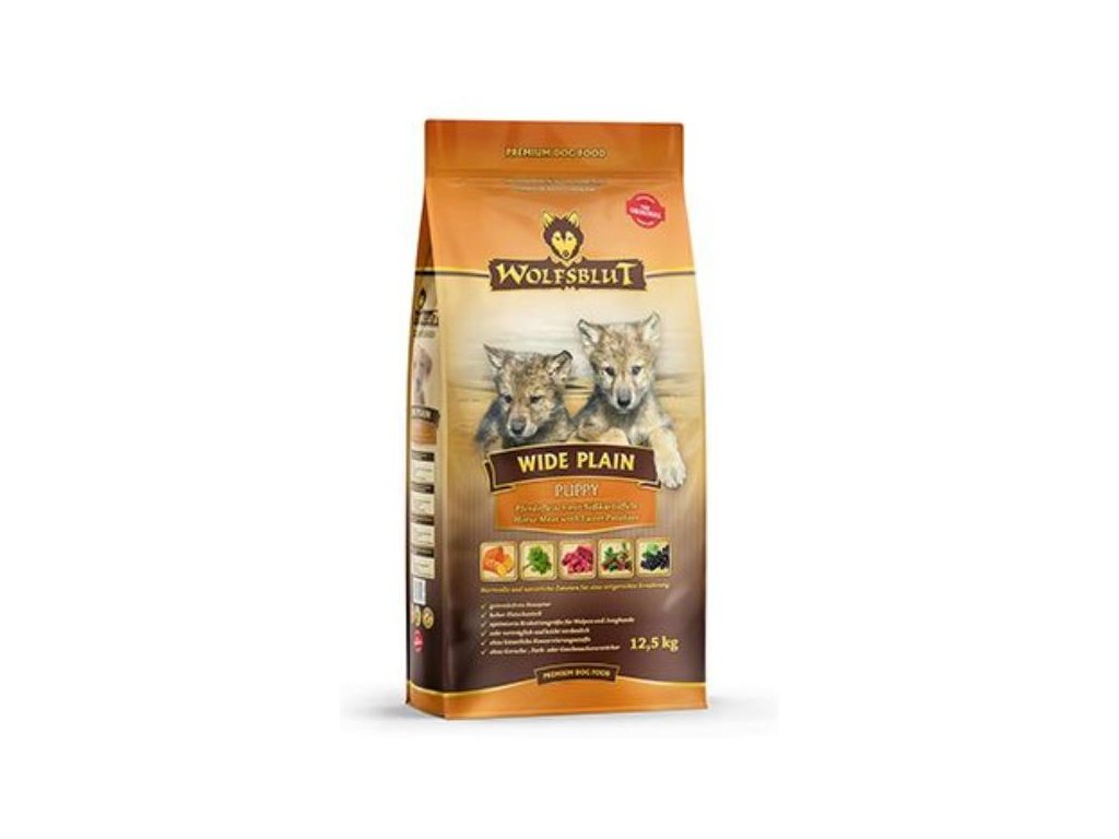 Vlci loví svou kořist ve Skalistých horách Severní Ameriky, arktické tundře, v horách a lesích Evropy a dokonce i v pouštích a stepích střední Asie. To jim poskytuje maso a vnitřnosti bohaté na živiny, ale také zeleninu, ovoce, bobule, kořeny a bylinky prostřednictvím obsahu žaludku kořisti. Obilí zde není zahrnuto. Vlk tak dostává potřebné vitamíny, minerály, stopové prvky, enzymy a druhotné rostlinné látky. Vzhledem k tomu, že vlk je předkem všech psů, naše suché krmivo pro psy Wolfsblut je založeno na přirozených stravovacích návycích vlka. Obsahuje hodně masa nebo ryb v kombinaci se superpotravinami, které obsahují hodnotné ingredience – stejně jako v přírodě, bez obilovin. Náš výběr výjimečných mas a superpotravin bohatých na živiny je založen na vlčím prostředí a jeho rozmanité stravě. Wolfsblut nabízí každému psovi druhově vhodnou a přirozenou stravu a díky rozmanitosti odrůd si každý něco toleruje. Receptura na suché krmivo WIDE PLAIN PUPPY kombinuje stravu vlka s nejnovějšími vědeckými poznatky o správné výživě psů.
