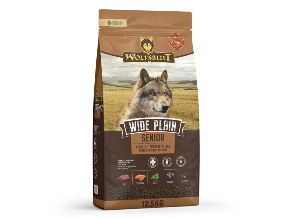 Vlci loví svou kořist ve Skalistých horách Severní Ameriky, arktické tundře, horách a lesích Evropy a dokonce i v pouštích a stepích Střední Asie. Ty jim z obsahu žaludku kořisti poskytují maso a na živiny bohaté vnitřnosti, stejně jako zeleninu, ovoce, bobule, kořeny a byliny. Obiloviny zde nejsou zahrnuty. Takto vlk získává vitamíny, minerály, stopové prvky, enzymy a druhotné rostlinné látky, které potřebuje. Vzhledem k tomu, že vlk je předkem všech psů, je naše suché krmivo pro psy Wolfsblut založeno na přirozených stravovacích návycích vlka. Obsahuje dostatek masa nebo ryb v kombinaci se superpotravinami, které obsahují cenné ingredience – stejně jako v přírodě, bez obilovin. Náš výběr výjimečného masa a superpotravin bohatých na živiny je založen na vlčím prostředí a jeho rozmanité stravě. WOLFSBLUT nabízí každému psovi druhově vhodnou a přirozenou stravu a díky své rozmanitosti si každý pes najde to, co snese. Receptura suchého krmiva WIDE PLAIN SENIOR kombinuje vlčí stravu s nejnovějšími vědeckými poznatky o správné výživě psů.