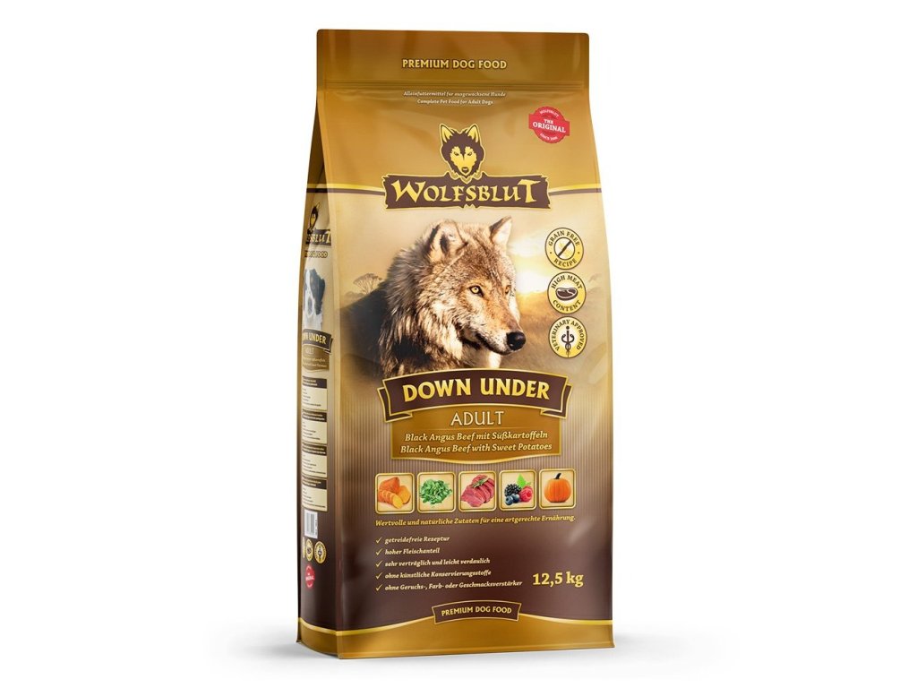 Vlci loví svou kořist od Skalistých hor Severní Ameriky, arktické tundry, hor a lesů Evropy až po pouště a stepi střední Asie. To jim dodává maso a vnitřnosti bohaté na živiny, ale také zeleninu, ovoce, bobule, kořeny a bylinky z obsahu žaludku kořisti. Obilí zde není zahrnuto. Vlk tak přijímá potřebné vitamíny, minerály, stopové prvky, enzymy a druhotné rostlinné látky. Vzhledem k tomu, že vlk je předkem všech psů, naše suché krmivo pro psy Wolfsblut je založeno na přirozených stravovacích návycích vlka. Obsahuje hodně masa nebo ryb v kombinaci se superpotravinami, které obsahují hodnotné ingredience – stejně jako v přírodě, bez obilovin. Náš výběr výjimečných druhů masa a superpotravin bohatých na živiny vychází z vlčích biotopů a jejich pestré stravy. Wolfsblut nabízí každému psovi druhově vhodnou a originální stravu a díky rozmanitosti odrůd si každý najde něco, co snese. Receptura Down Under Adult kombinuje krmivo pro vlky s nejnovějšími vědeckými poznatky o správné výživě psů.