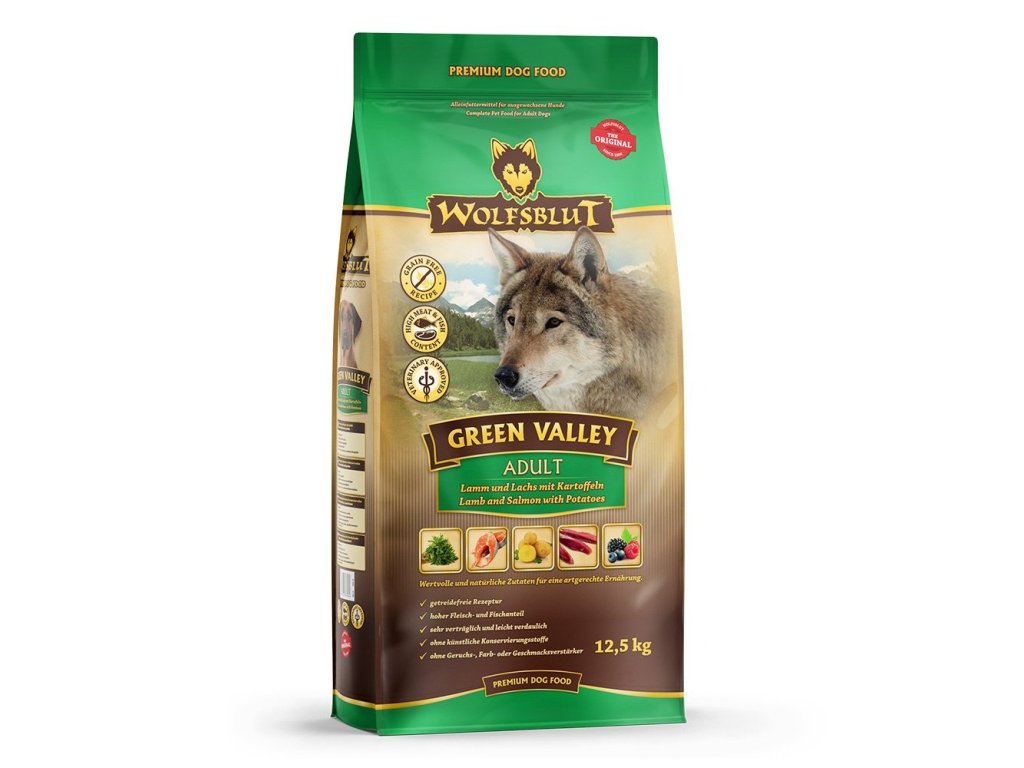 Vlci loví svou kořist od Skalistých hor Severní Ameriky, arktické tundry, hor a lesů Evropy až po pouště a stepi střední Asie. To jim dodává maso a vnitřnosti bohaté na živiny, ale také zeleninu, ovoce, bobule, kořeny a bylinky z obsahu žaludku kořisti. Obilí zde není zahrnuto. Vlk tak přijímá potřebné vitamíny, minerály, stopové prvky, enzymy a druhotné rostlinné látky. Vzhledem k tomu, že vlk je předkem všech psů, naše suché krmivo pro psy Wolfsblut je založeno na přirozených stravovacích návycích vlka. Obsahuje hodně masa nebo ryb v kombinaci se superpotravinami, které obsahují hodnotné ingredience – stejně jako v přírodě, bez obilovin. Náš výběr výjimečných druhů masa a superpotravin bohatých na živiny vychází z vlčích biotopů a jejich pestré stravy. Wolfsblut nabízí každému psovi druhově vhodnou a originální stravu a díky rozmanitosti odrůd si každý najde něco, co snese. Receptura suchého krmiva GREEN VALLEY kombinuje výživu vlků s nejnovějšími vědeckými poznatky o správné výživě psů.