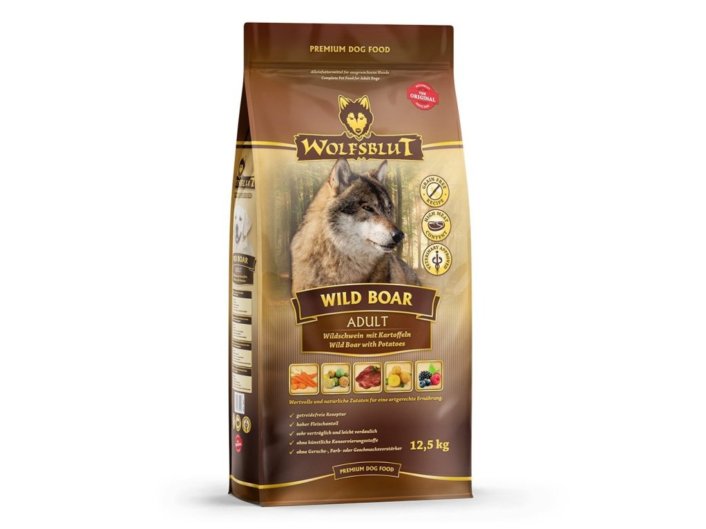 Vlci loví svou kořist od Skalistých hor Severní Ameriky, arktické tundry, hor a lesů Evropy až po pouště a stepi střední Asie. To jim dodává maso a vnitřnosti bohaté na živiny, ale také zeleninu, ovoce, bobule, kořeny a bylinky z obsahu žaludku kořisti. Obilí zde není zahrnuto. Vlk tak přijímá potřebné vitamíny, minerály, stopové prvky, enzymy a druhotné rostlinné látky. Vzhledem k tomu, že vlk je předkem všech psů, naše suché krmivo pro psy Wolfsblut je založeno na přirozených stravovacích návycích vlka. Obsahuje hodně masa nebo ryb v kombinaci se superpotravinami, které obsahují hodnotné ingredience – stejně jako v přírodě, bez obilovin. Náš výběr výjimečných druhů masa a superpotravin bohatých na živiny vychází z vlčích biotopů a jejich pestré stravy. Wolfsblut nabízí každému psovi druhově vhodnou a originální stravu a díky rozmanitosti odrůd si každý najde něco, co snese. Receptura na suché krmivo WILD BOAR ADULT kombinuje výživu vlků s nejnovějšími vědeckými poznatky o správné výživě psů.